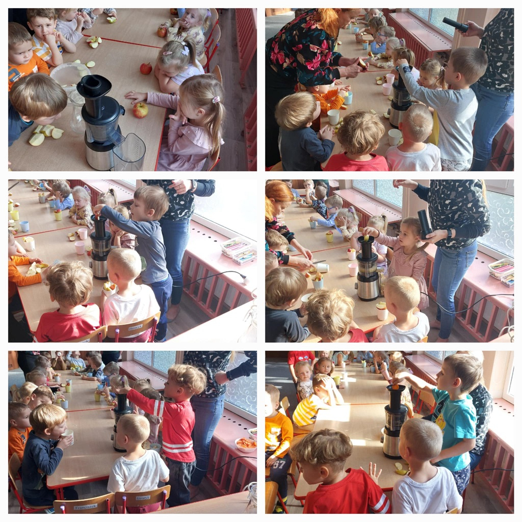 Jednak zanim przystąpiliśmy do pracy, przedszkolaki zapoznały się z urządzeniem do robienia soku – sokowirówką, jego działaniem oraz utrwaliły podstawowe zasady higieny i bezpieczeństwa. Następnie dzieci samodzielnie wyciskały sok.
