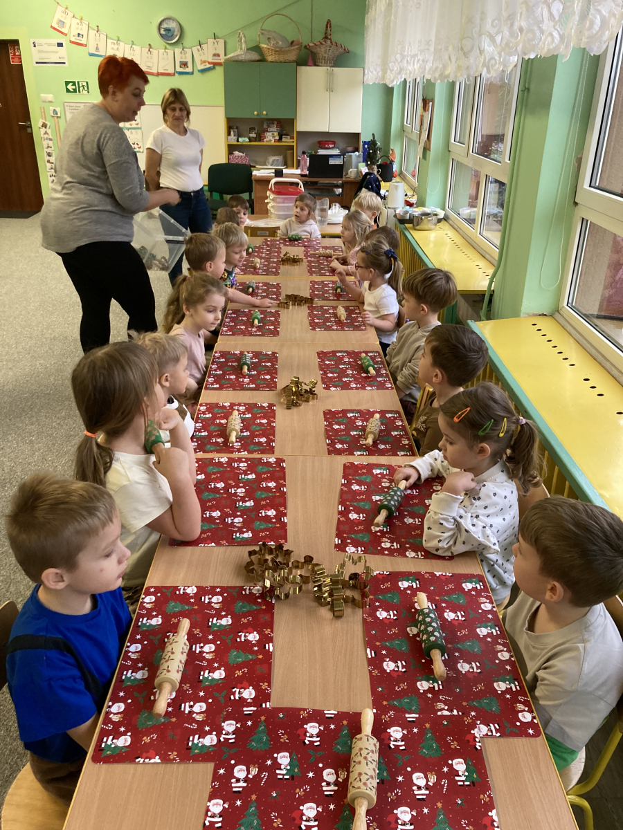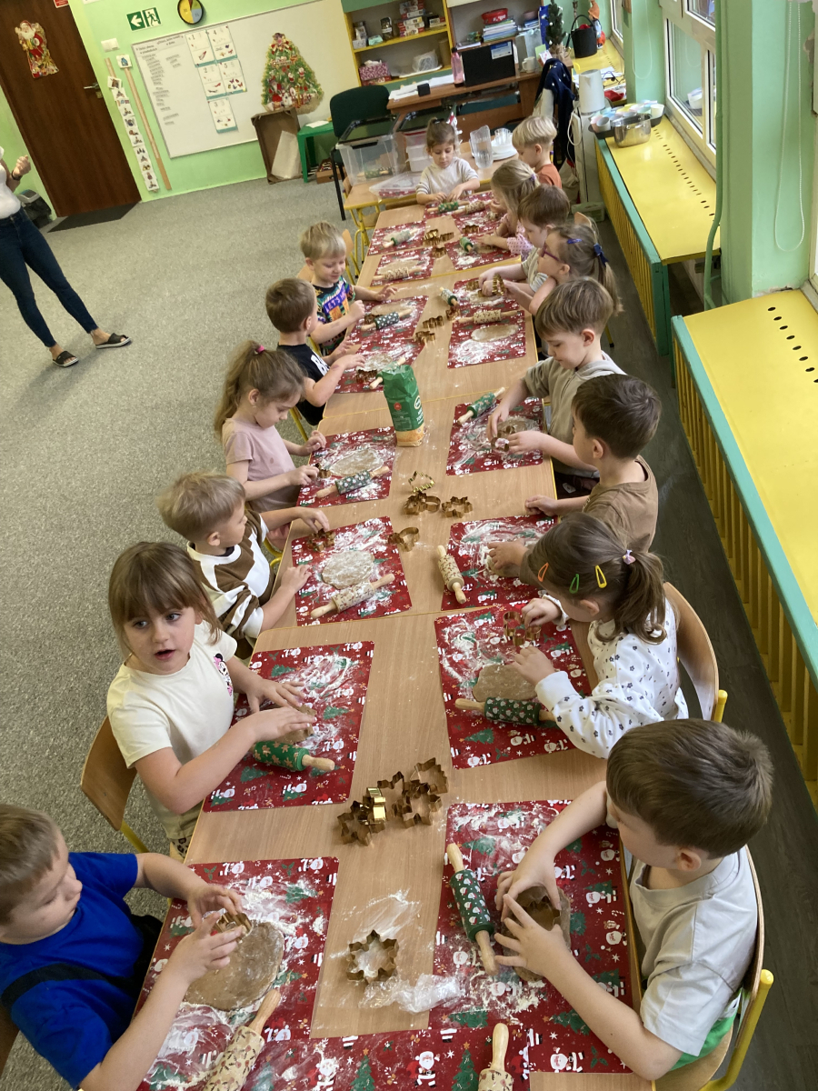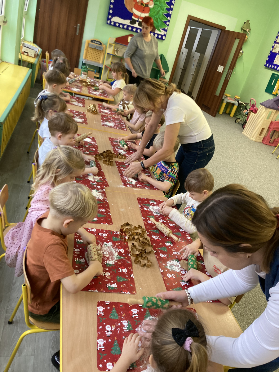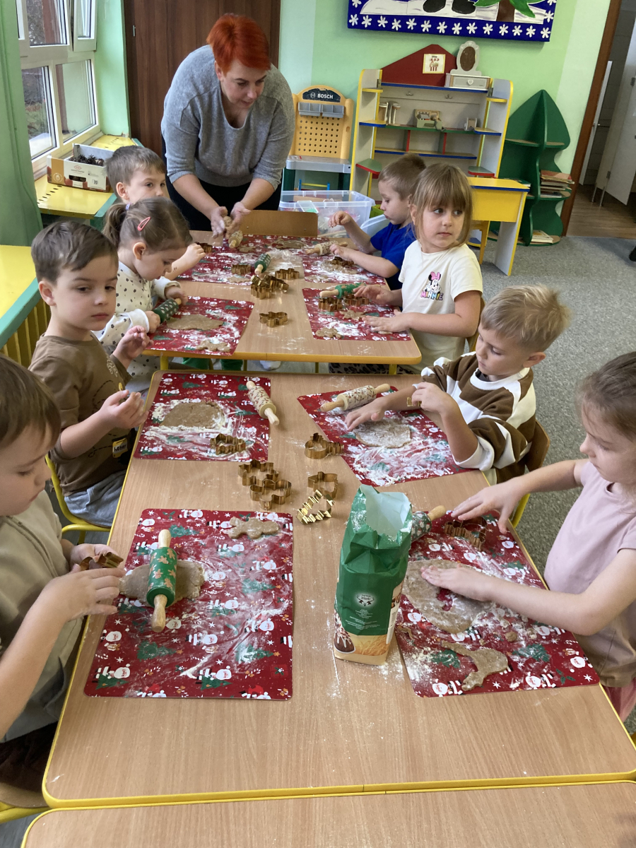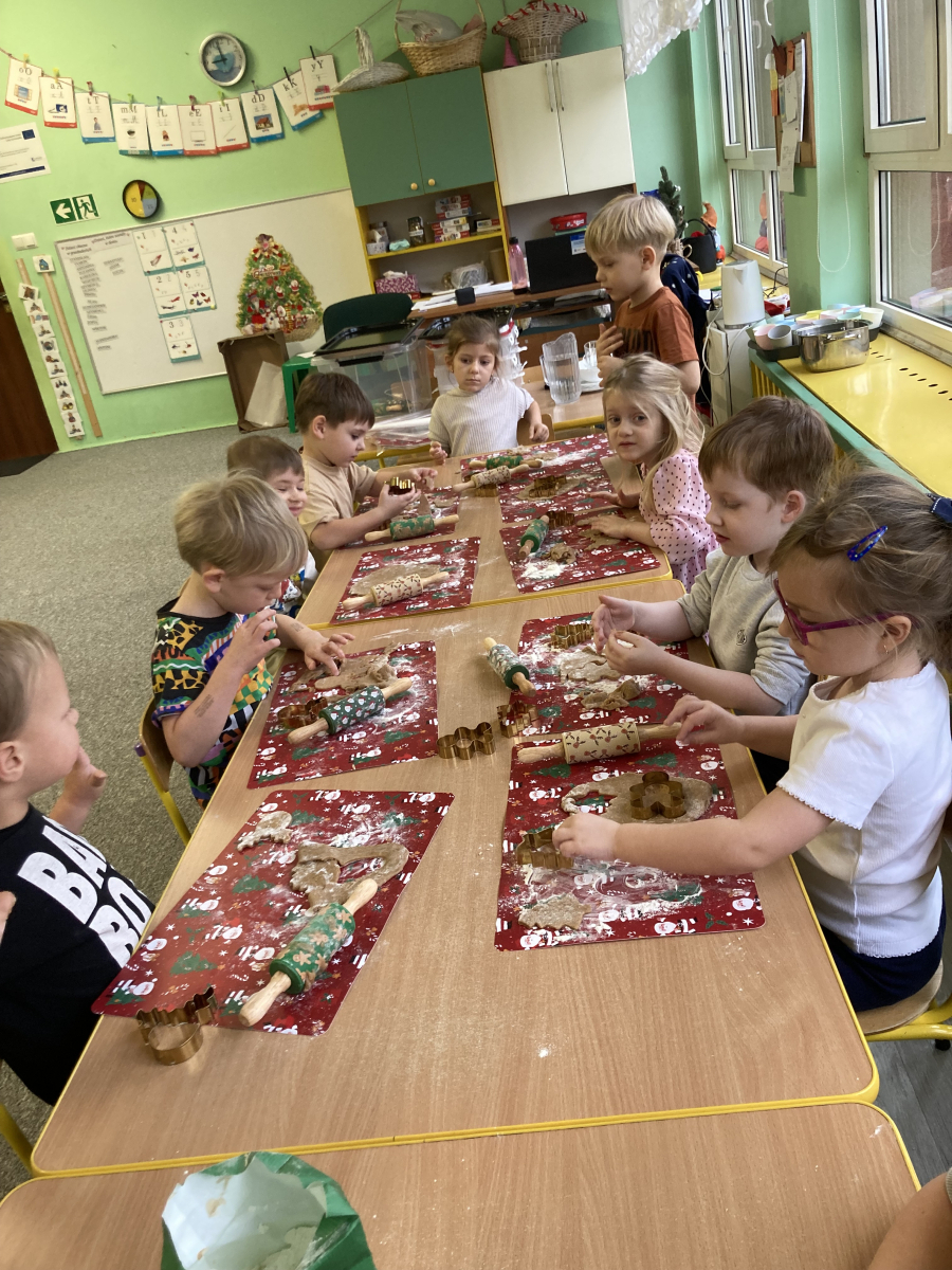 - przedszkolaki aktywnie samodzielnie wałkowały ciasto i wykrawały różne kształty pierniczków,