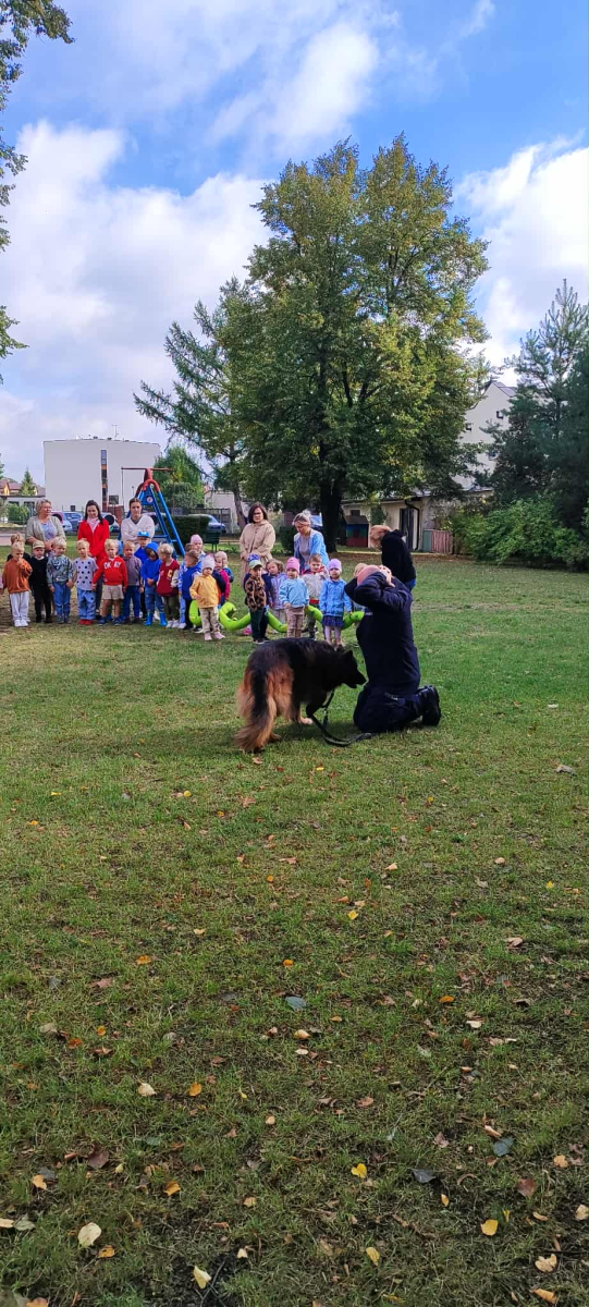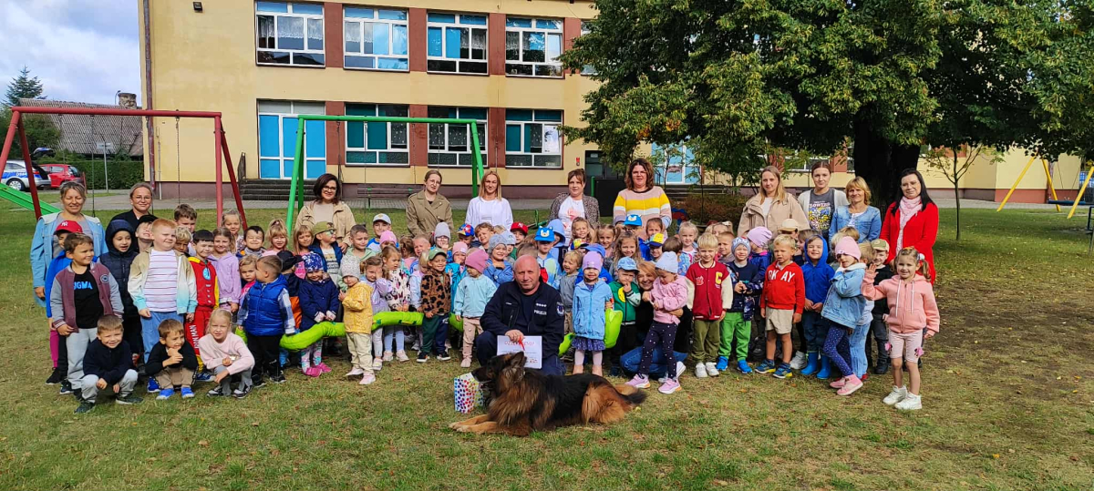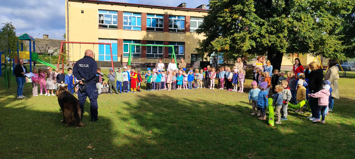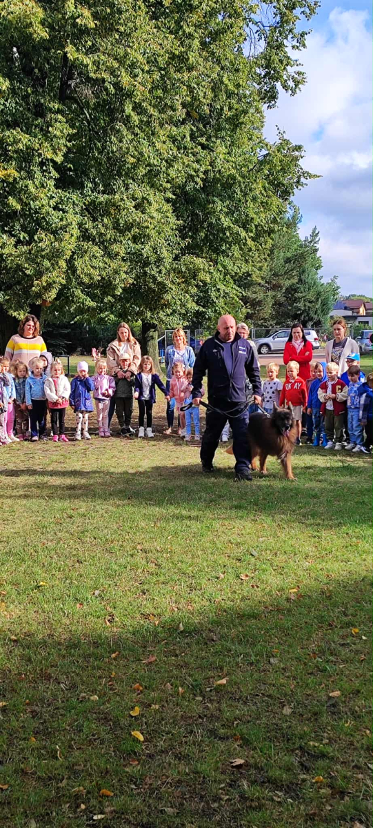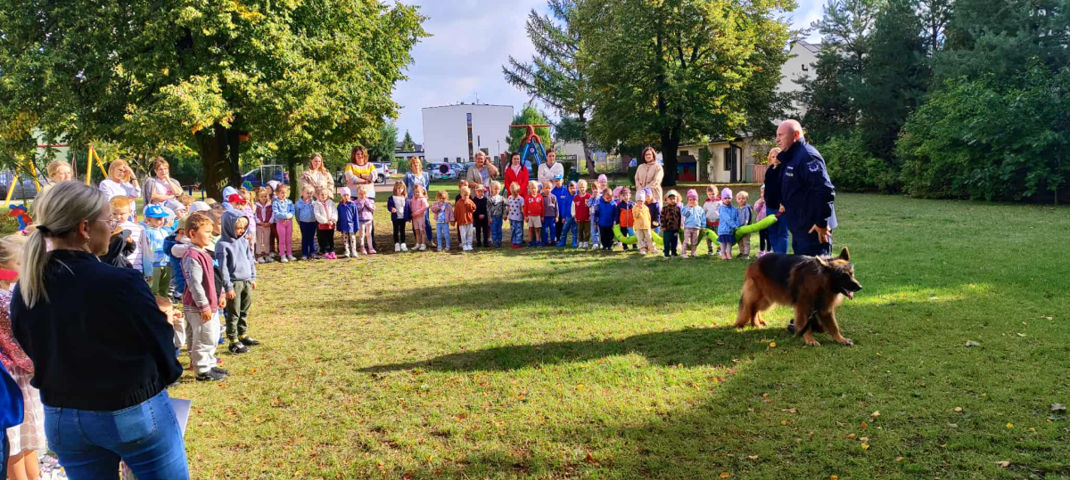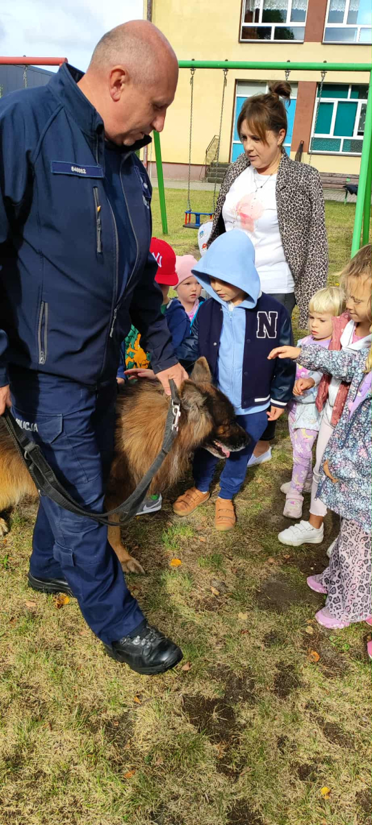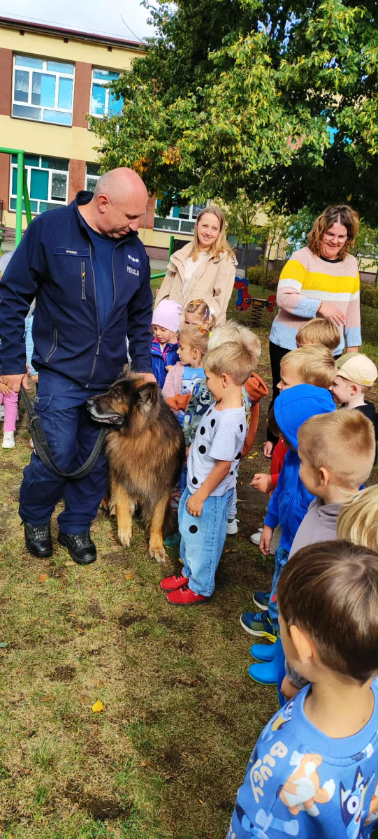 W dn. 15 września w naszym przedszkolu odwiedził nas policjant ze specjalnie przeszkolonym psem. Przewodnik psa tropiącego opowiedział dzieciom na czym polega jego praca, po co psy pracują w policji oraz czym dokładnie się zajmują. Przeprowadził krótki pokaz związany z posłuszeństwem i wykonywaniem komend przez czworonoga. Dzieci z zachwytem przyglądały się umiejętnościom psa. Następnie odbyła się pogadanka na temat bezpieczeństwa. Policjanci zaprezentowali bezpieczną pozycję „Żółwia”, którą należy przyjąć w przypadku ataku ze strony psa.
