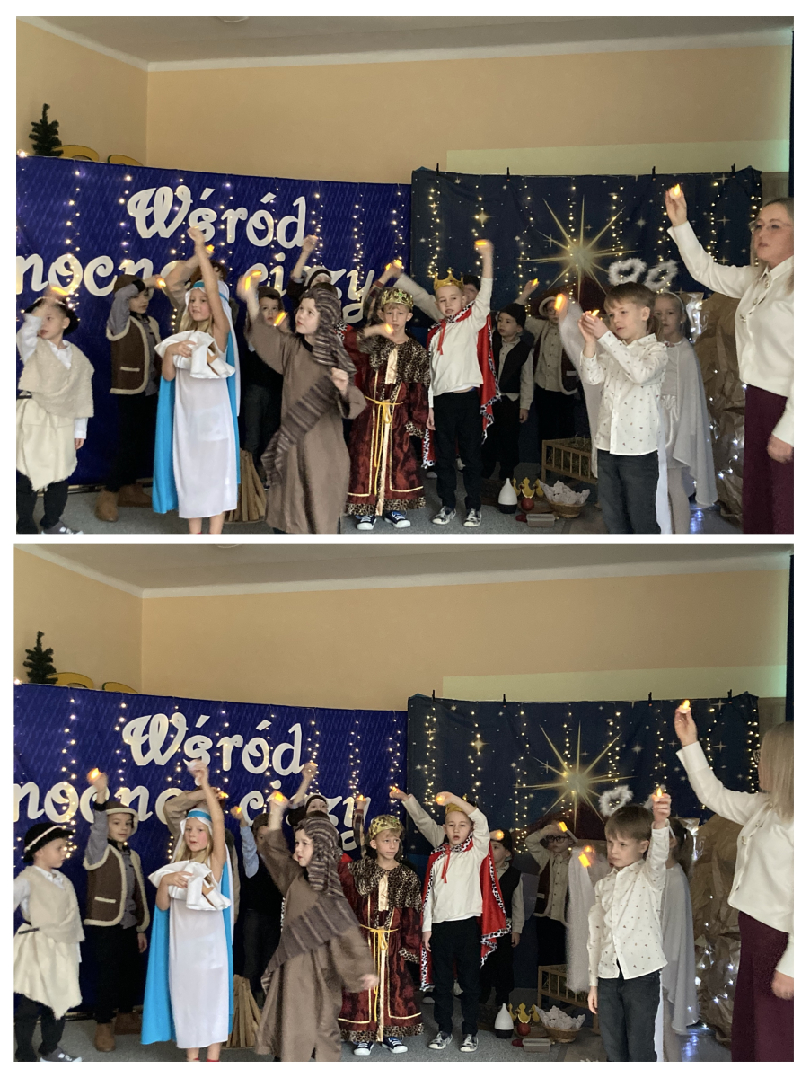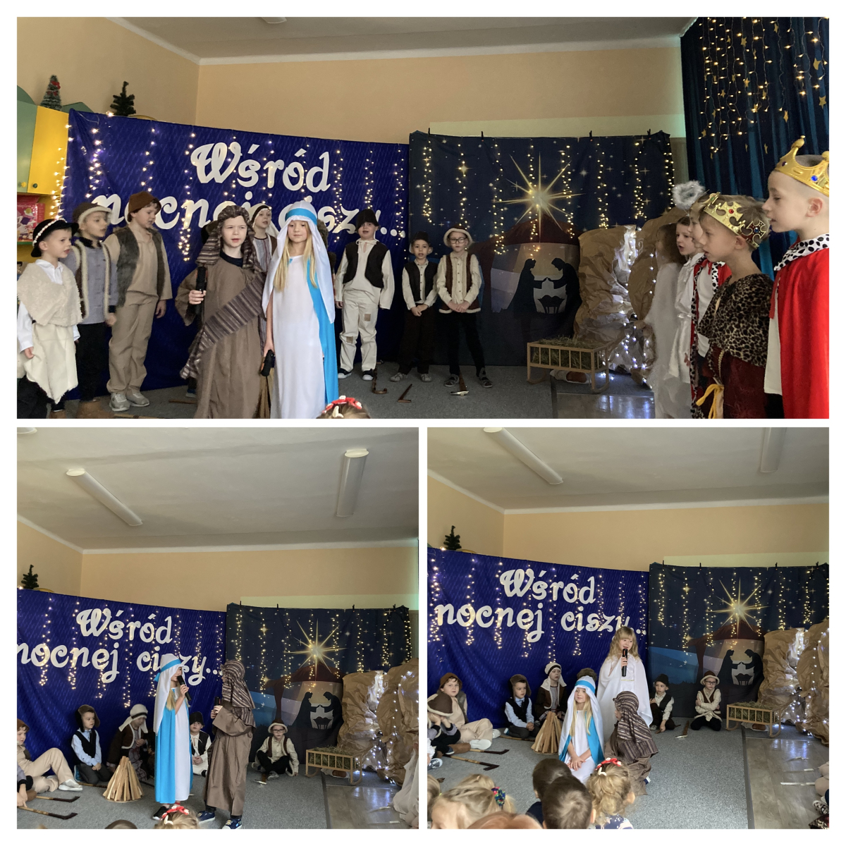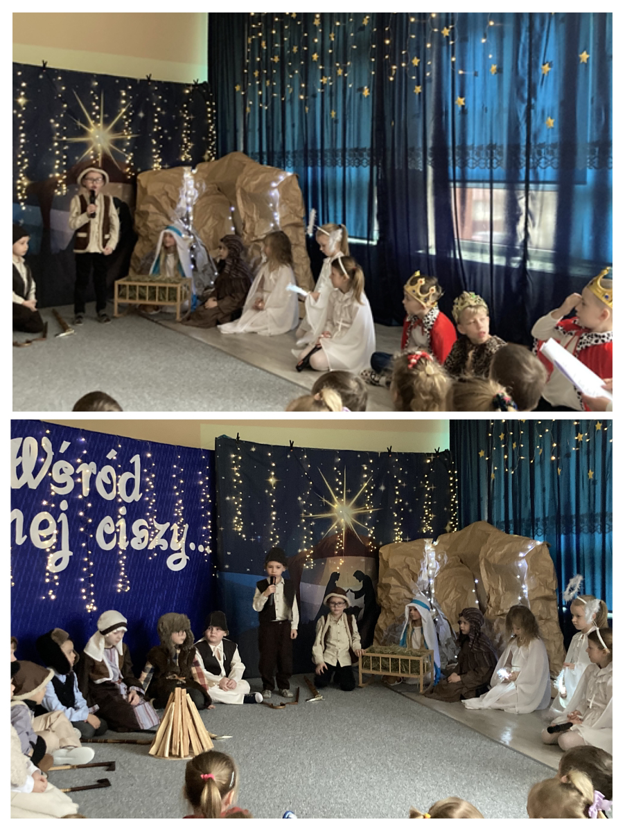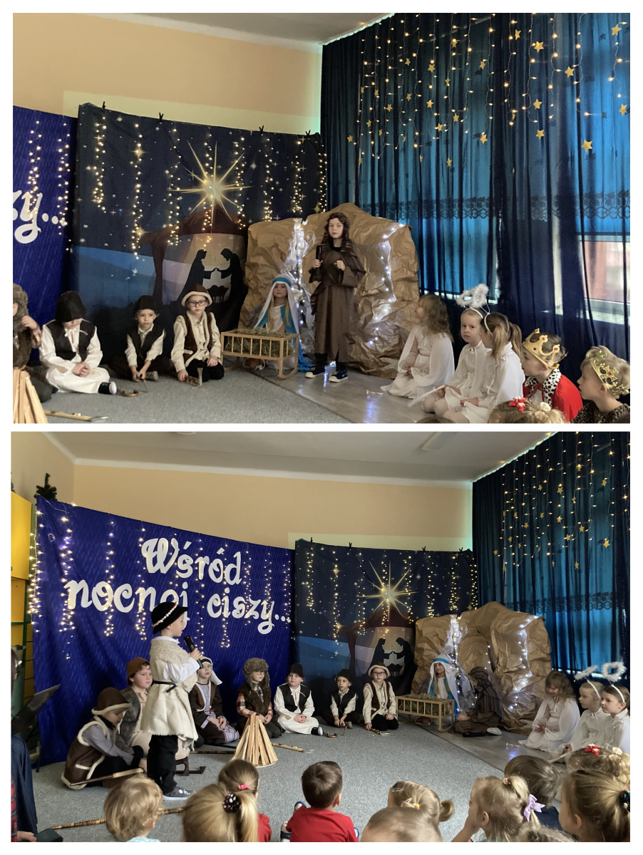 Mali artyści, ubrani w piękne stroje, z wielkim przejęciem wcielili się w role Maryi i Józefa, pasterzy, aniołków oraz trzech króli. Scenariusz obfitował w nastrojowe kolędy i pastorałki, które wspólnie wyśpiewane, poruszyły serca wszystkich zgromadzonych widzów.
