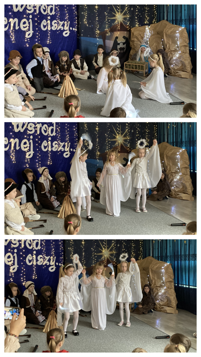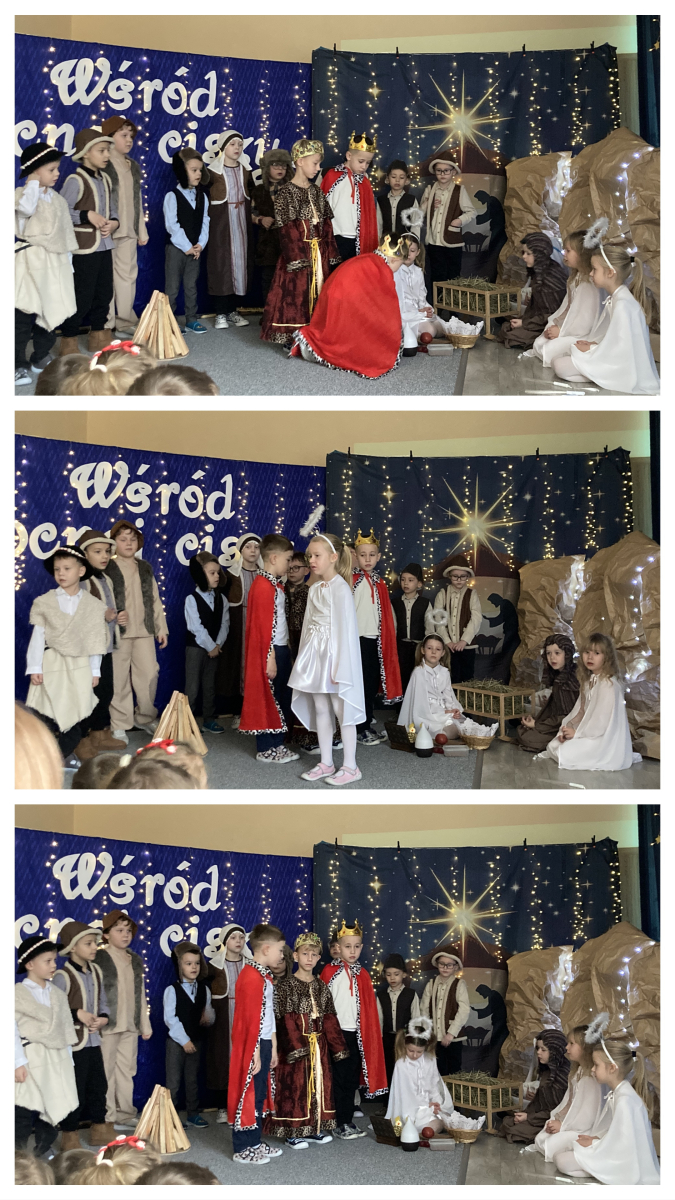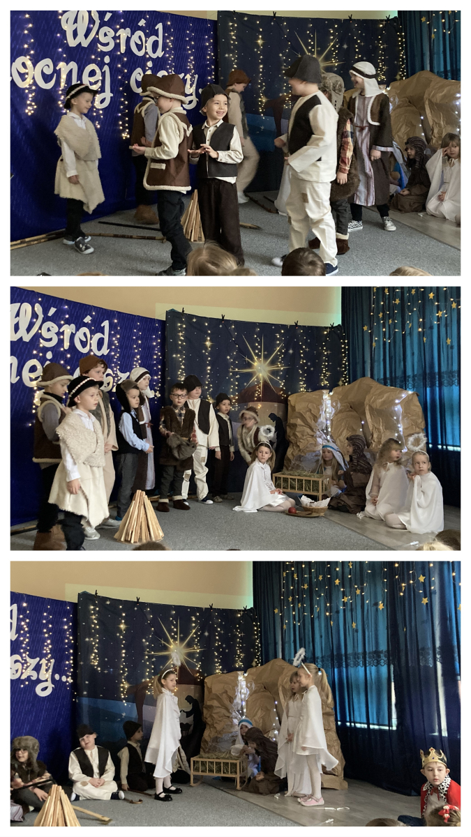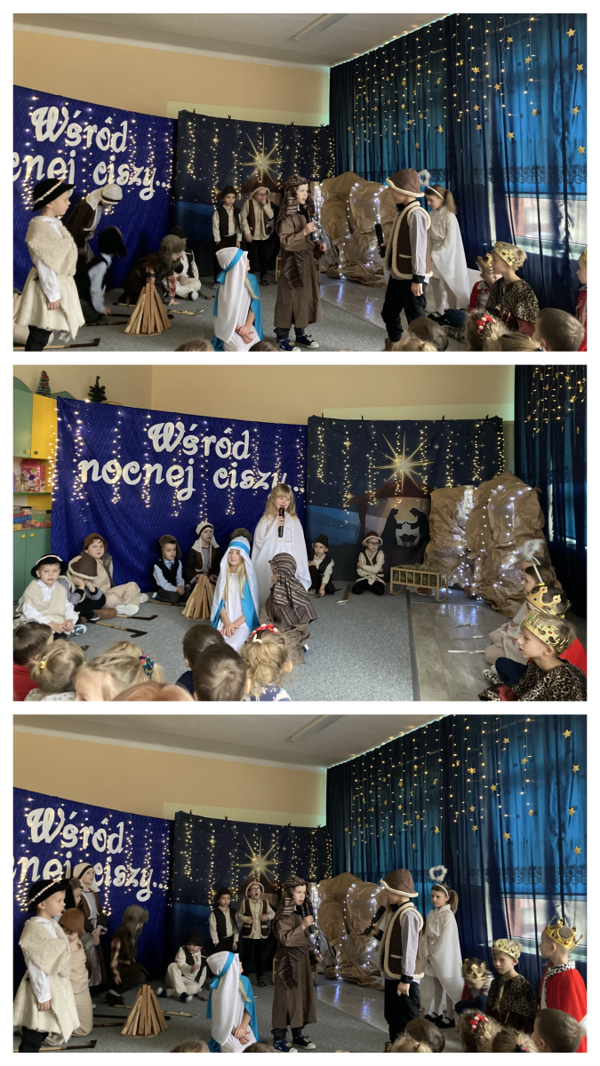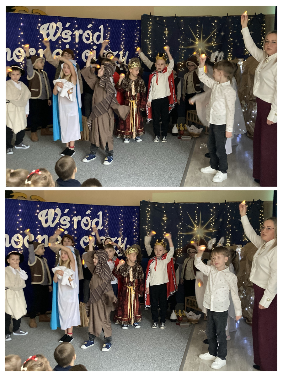 Mali artyści, ubrani w piękne stroje, z wielkim przejęciem wcielili się w role Maryi i Józefa, pasterzy, aniołków oraz trzech króli. Scenariusz obfitował w nastrojowe kolędy i pastorałki, które wspólnie wyśpiewane, poruszyły serca wszystkich zgromadzonych widzów.
