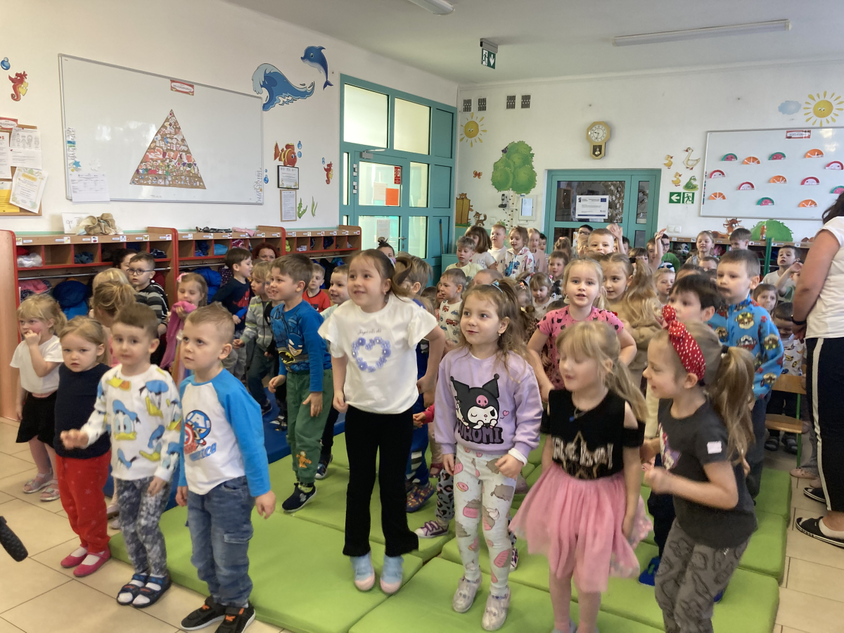 Podczas występu przedszkolaki miały okazję poznać różne instrumenty muzyczne, posłuchać wesołych piosenek oraz aktywnie uczestniczyć w koncercie – śpiewając, klaszcząc i tańcząc razem z muzykami. Występ był pełen energii, humoru i pozytywnych emocji, dzięki czemu dzieci z ogromnym zainteresowaniem brały w nim udział.