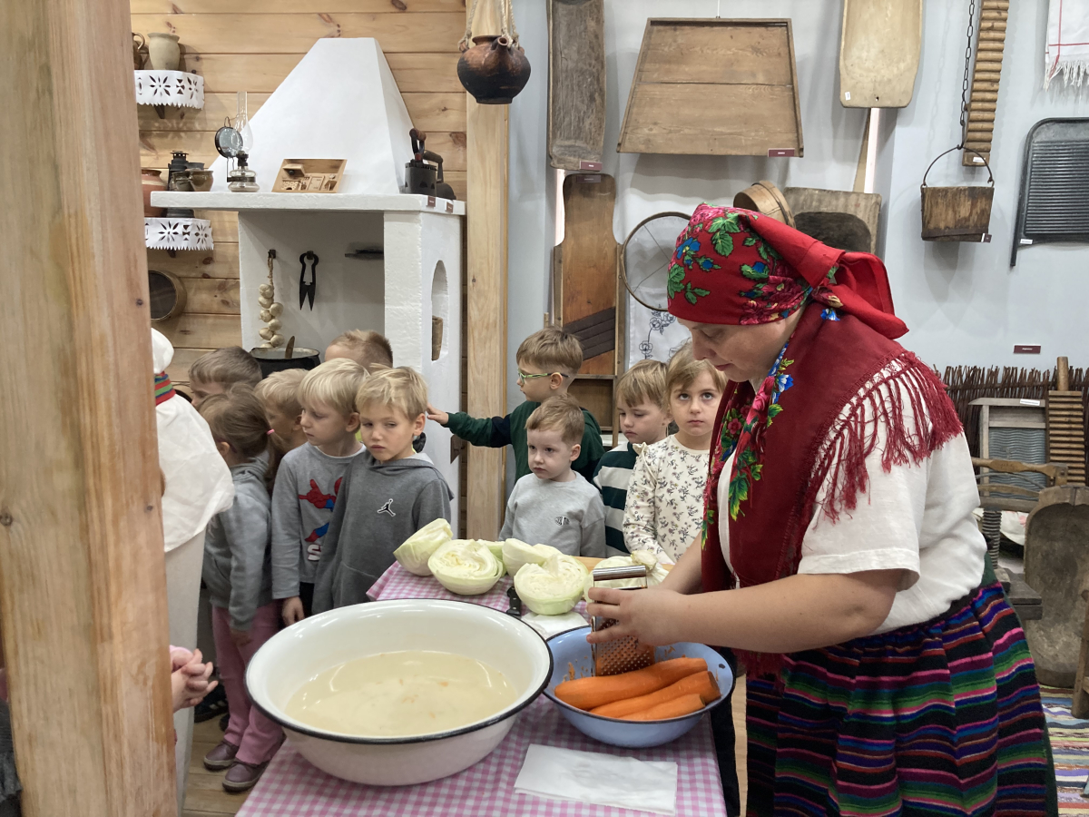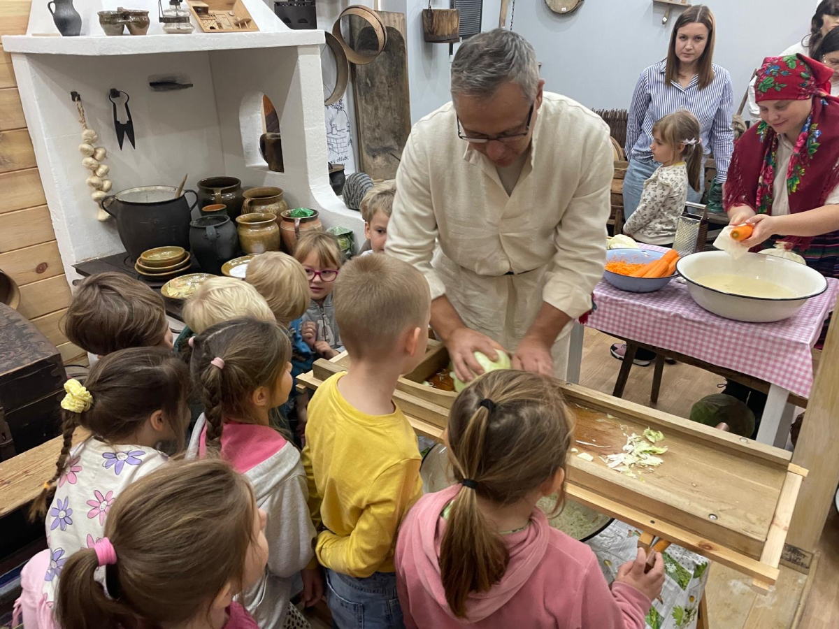 Organizatorzy warsztatów postarali się o wszystkie akcesoria potrzebne do przygotowania kiszonej kapusty – najwięcej radości sprawiło dzieciom oczywiście szatkowanie i ubijanie kapusty w beczce. Wnętrze tradycyjnej chaty chłopskiej – element wystawy muzealnej dopełniło odpowiedni klimat dawnych czasów.