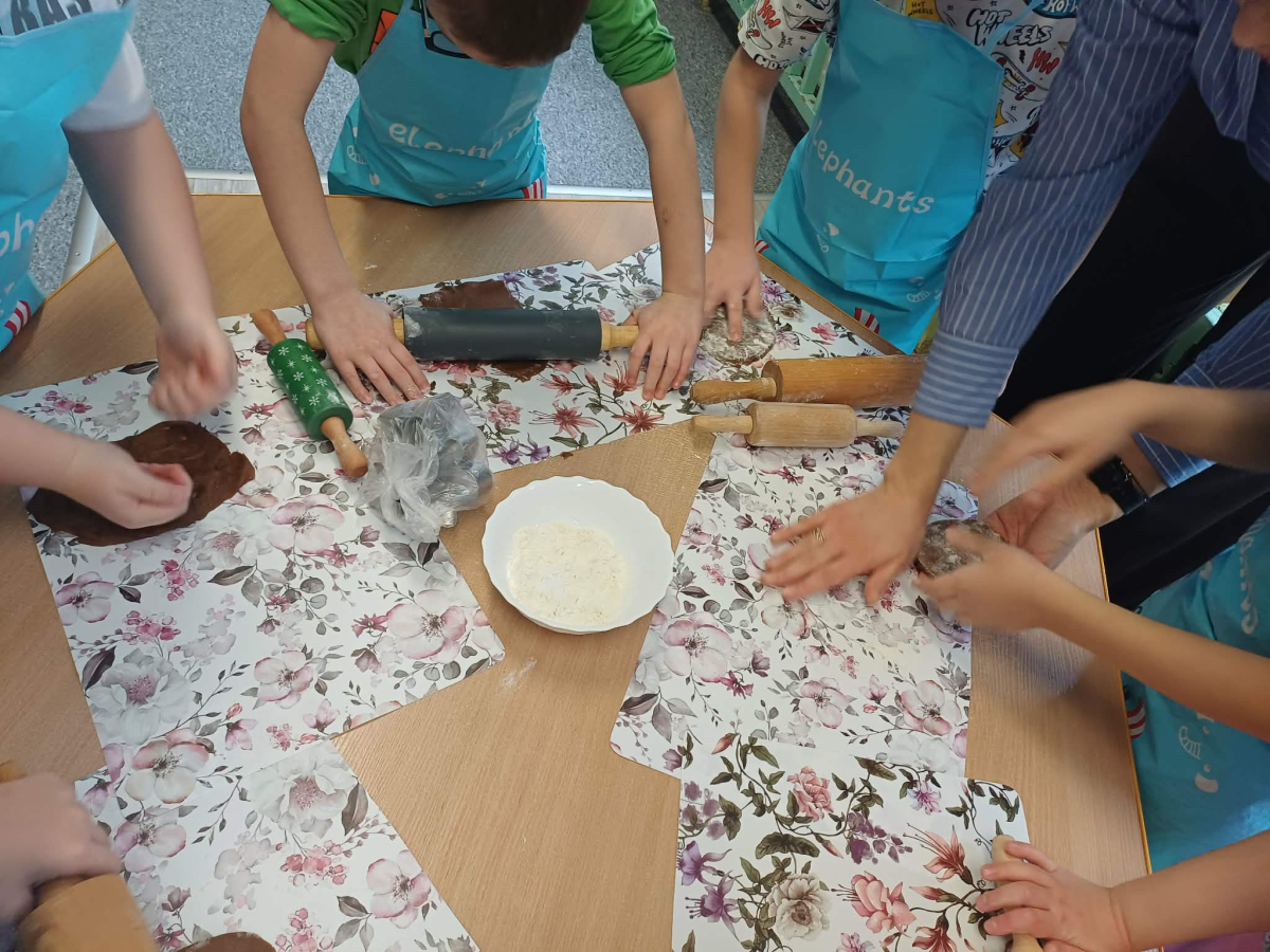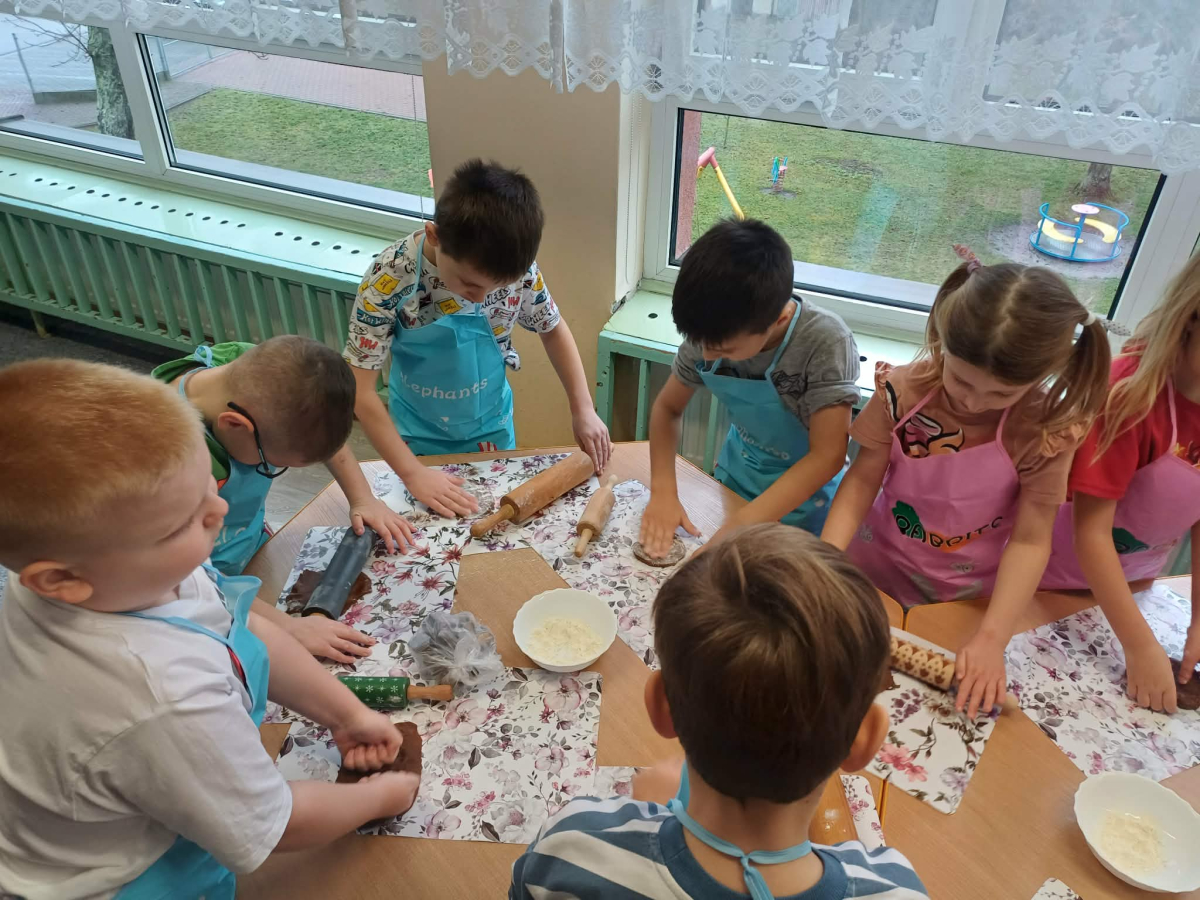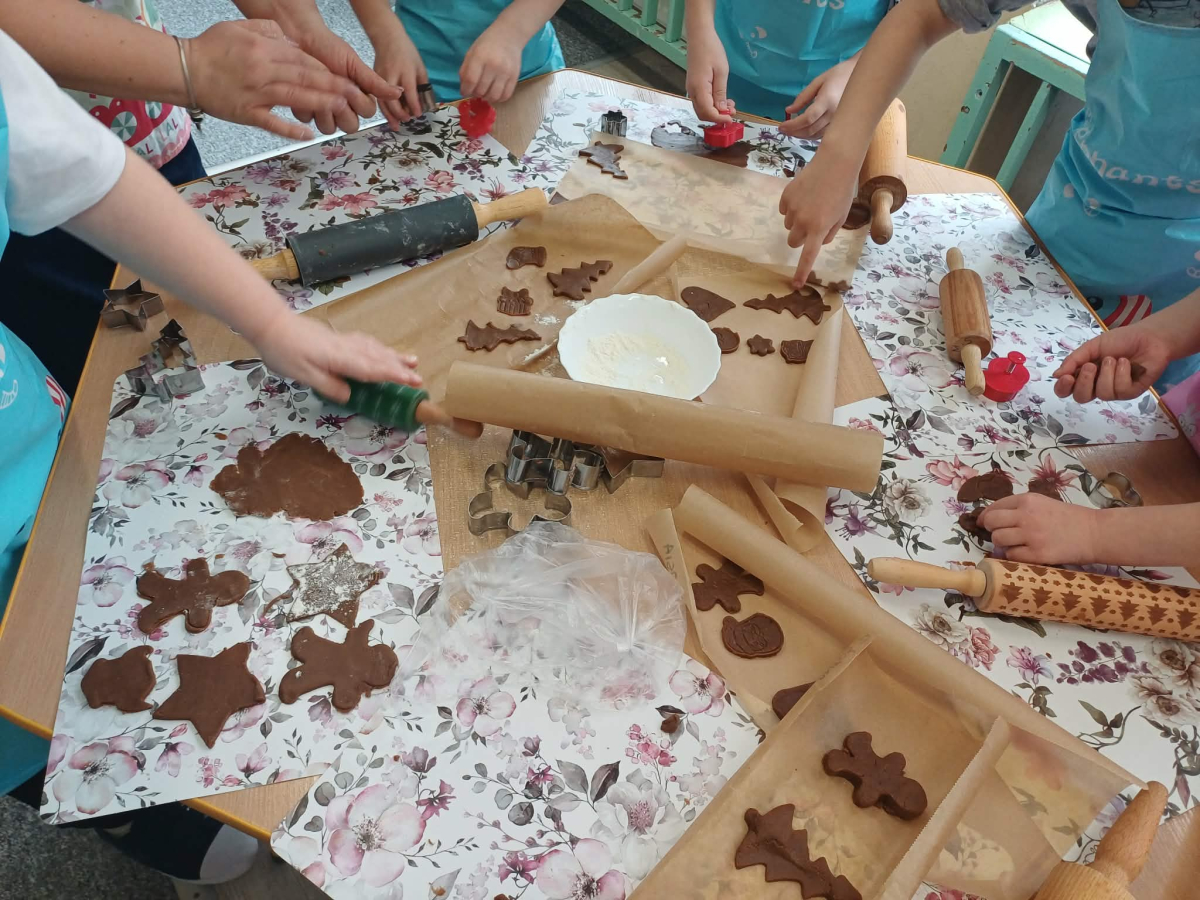 Podczas spotkania mama Dominika opowiedziała dzieciom o przygotowaniu ciasta i wspólnym pieczeniu, przedszkolaki z wielkim zaangażowaniem samodzielnie wałkowały ciasto i wykrawały różne kształty pierniczków. Gotowe, ułożone na blaszkach pierniczki powędrowały do przedszkolnego piekarnika. Po chwili całe przedszkole wypełniło się niesamowitym zapachem, który natychmiast wprowadził wszystkich w świąteczny nastrój.
