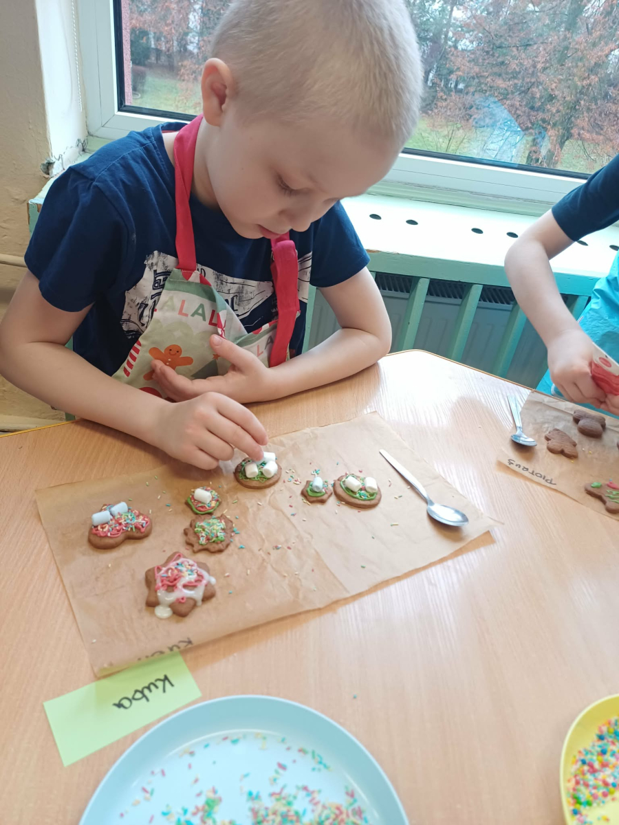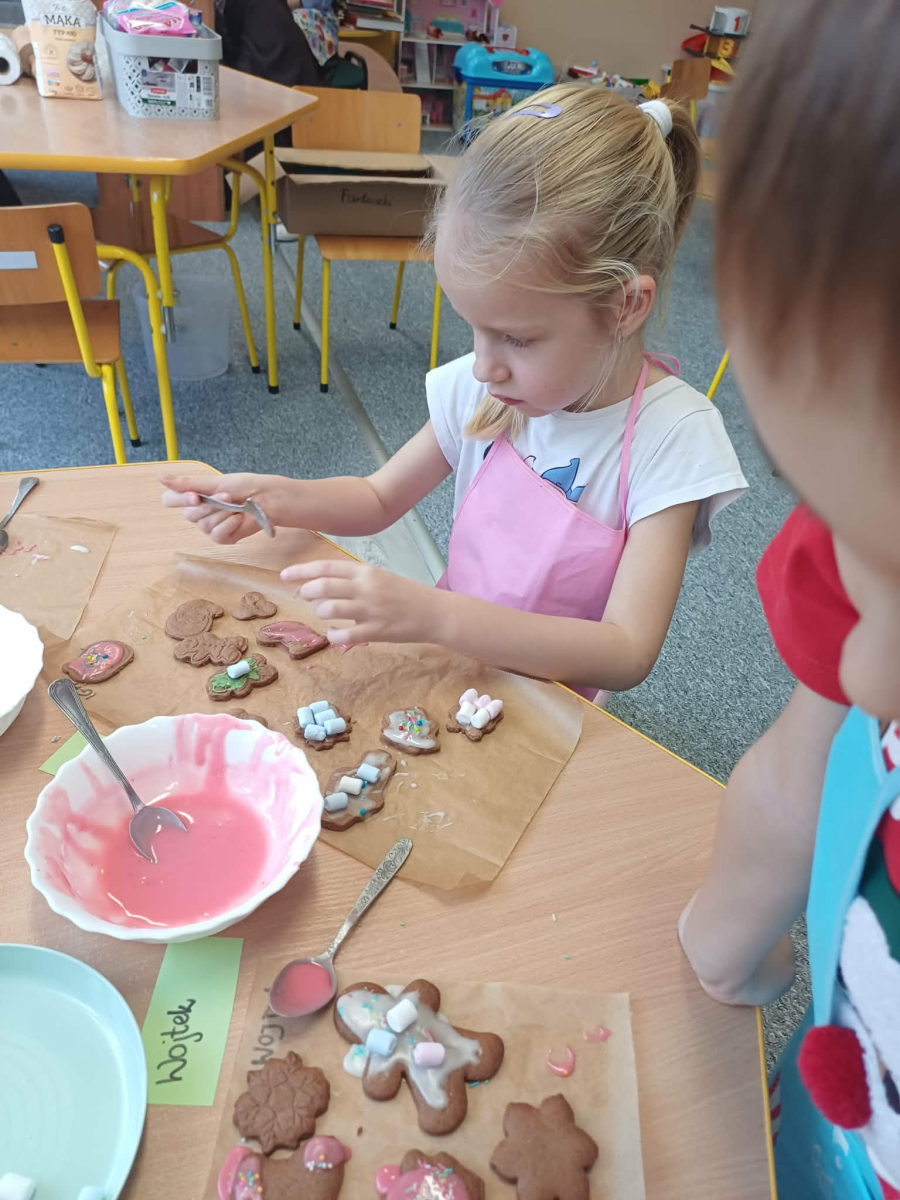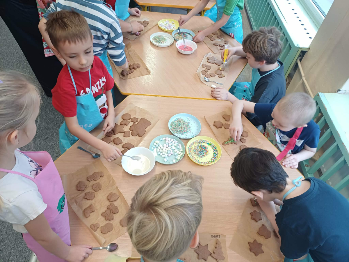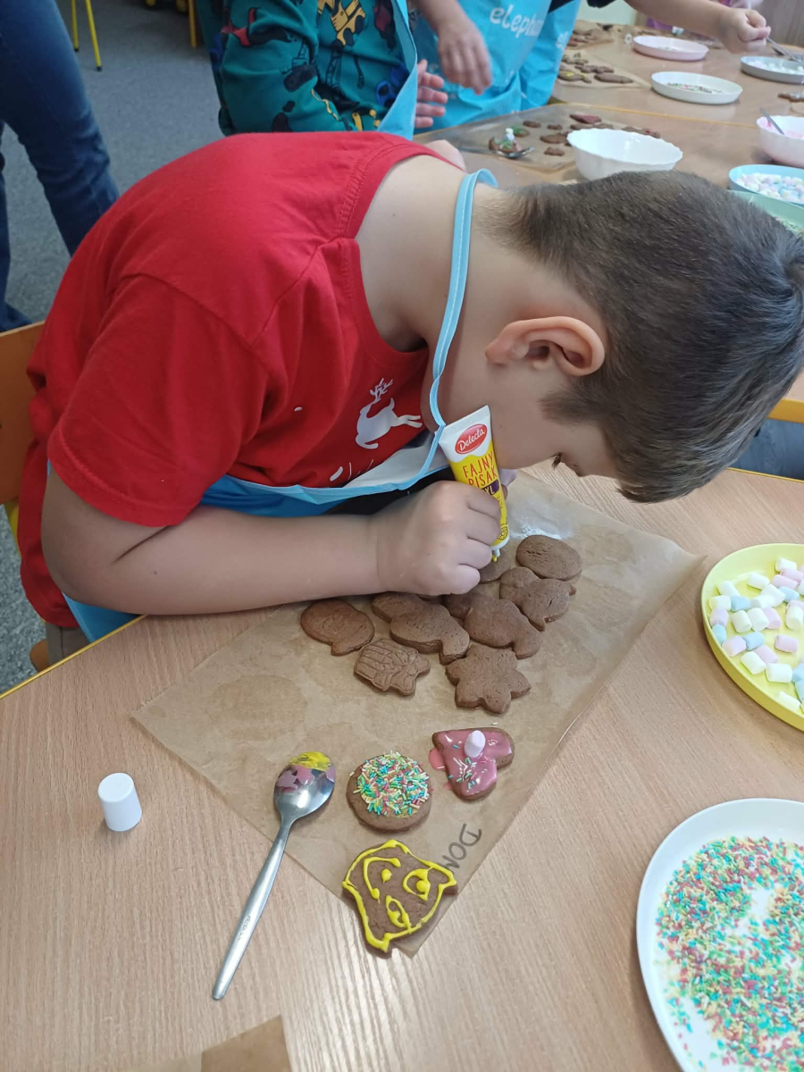 Po ostygnięciu ciasteczek nadszedł czas na największą frajdę – dekorowanie! Na stołach pojawiły się kolorowe lukry, posypki, perełki i pianki. Dzieci zamieniły proste pierniczki w małe, jadalne dzieła sztuki.