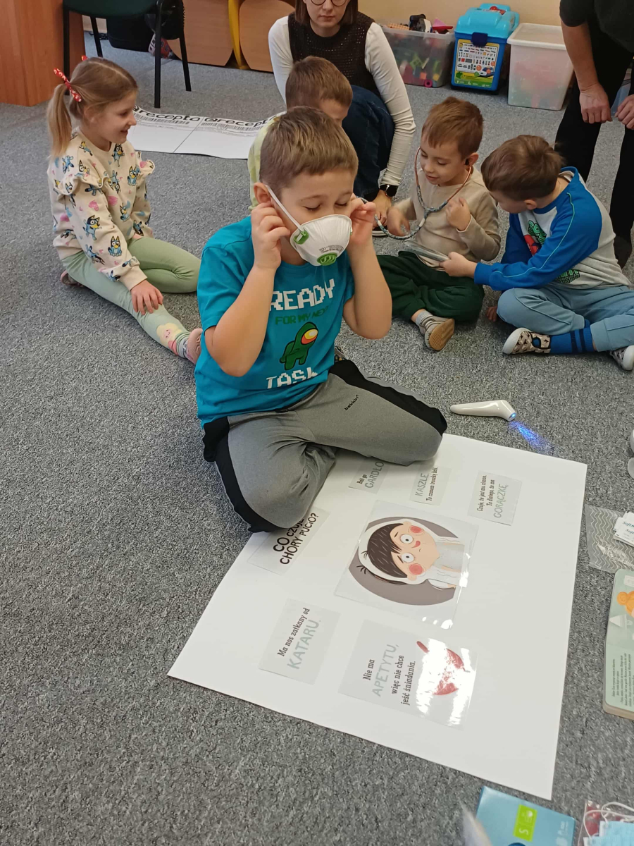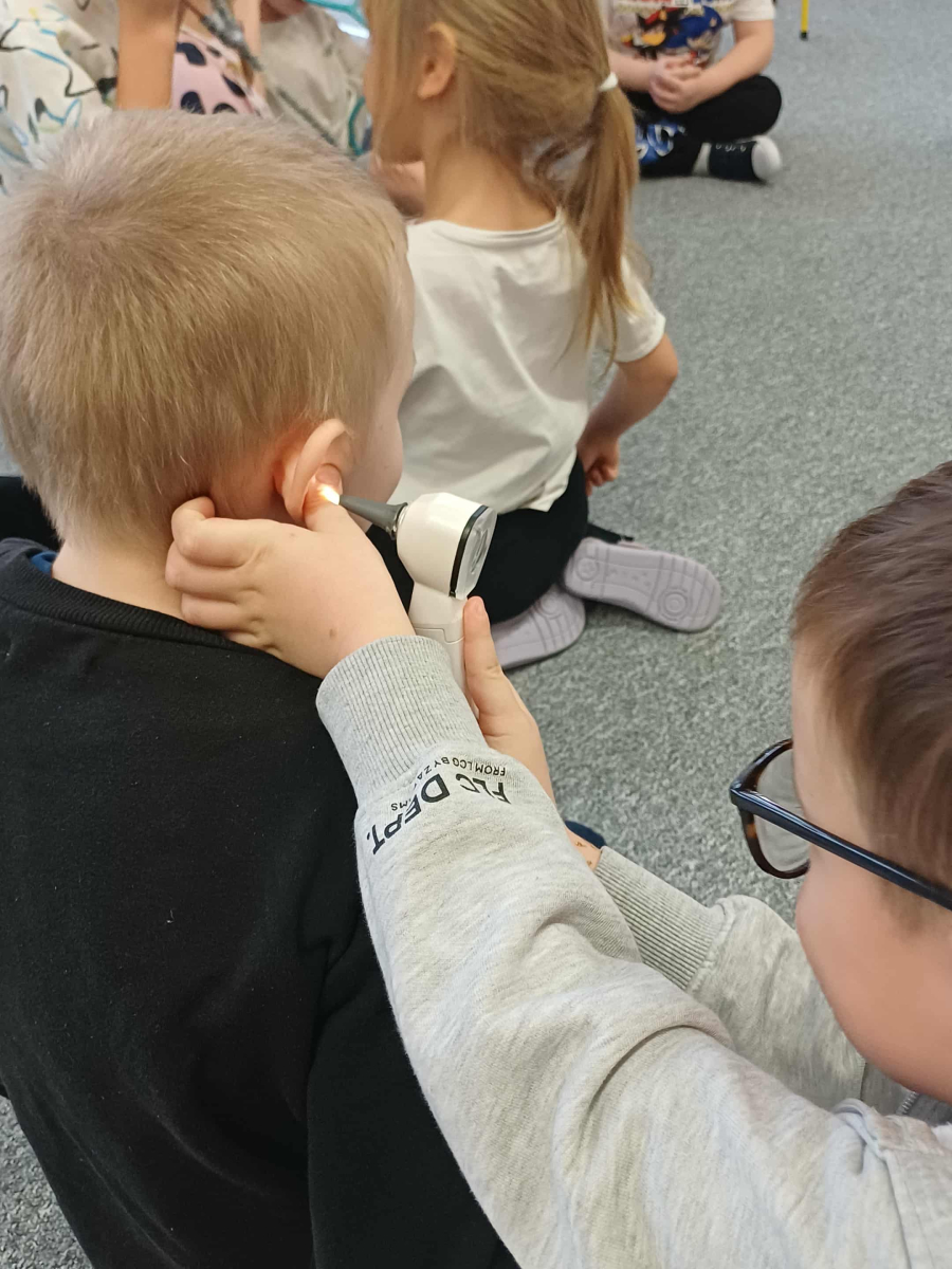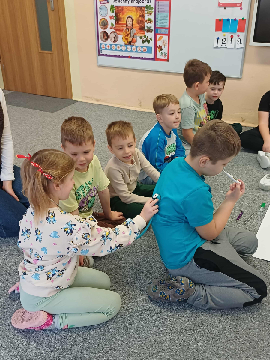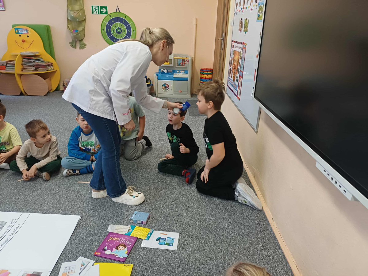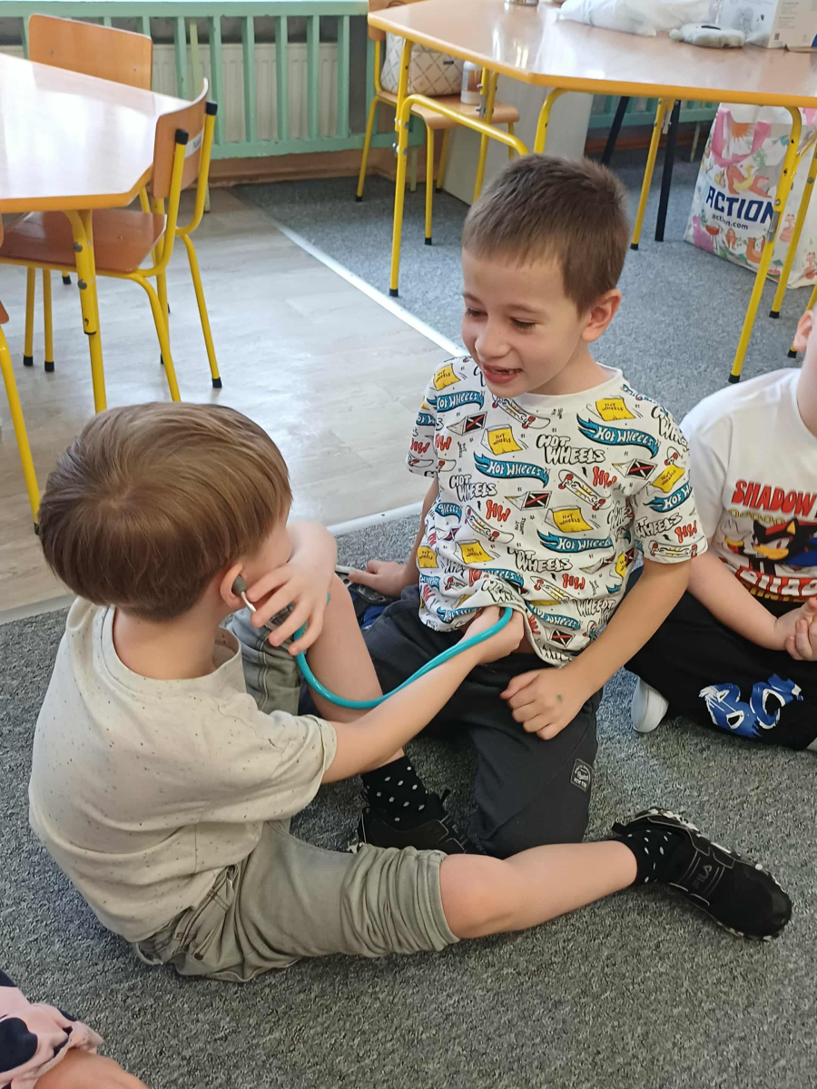 Wizyta pani doktor, mamy Wojtusia, w przedszkolu okazała się wspaniałą lekcją o zdrowiu i emocjach, opartą na ulubionych przez dzieci książeczkach. Pani doktor, w profesjonalnym stroju i z uśmiechem, opowiadała o swojej pracy, wykorzystując historie dobrze znane przedszkolakom. Na przykładzie książki "Kicia Kocia jest chora" wytłumaczyła dzieciom, że gabinet lekarski to przyjazne miejsce, a lekarze i pielęgniarki chcą im pomóc, tak jak pomogli Kici Koci, gdy bolał ją brzuszek. Dzieci dowiedziały się, że badanie nie boli i nie ma się czego bać. Następnie, odwołując się do serii o Pucio, pani doktor omówiła, jak ważne jest nazywanie i wyrażanie emocji związanych z chorobą czy wizytą u lekarza. Podkreśliła, że strach jest naturalny i zawsze można o nim porozmawiać z rodzicami lub lekarzem. Dzieci z entuzjazmem uczestniczyły w zabawie, badając siebie na wzajem za pomocą stetoskopu i innych bezpiecznych akcesoriów medycznych. Każde dziecko, naśladując Kicię Kocię, mogło osłuchać "pacjenta" i sprawdzić, jak bije jego serduszko. Na koniec dzieci wykonały z ciastoliny bakterie i wirusy. Wizyta była nie tylko pouczająca, ale także terapeutyczna. Dzięki połączeniu wiedzy medycznej z lubianymi książkowymi bohaterami, dzieci oswoiły lęk przed lekarzami i zrozumiały, że dbanie o zdrowie i emocje jest bardzo ważne.
