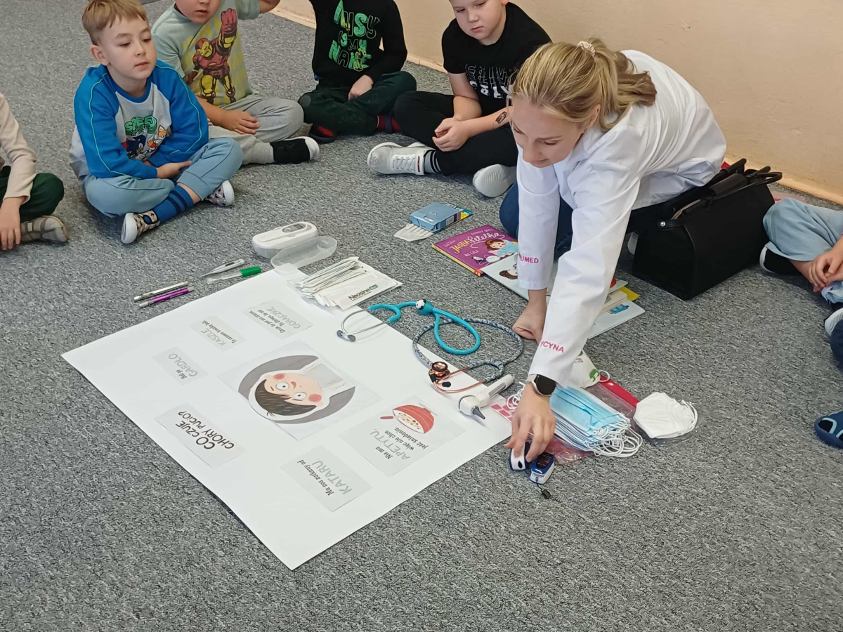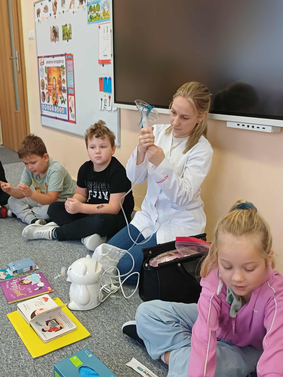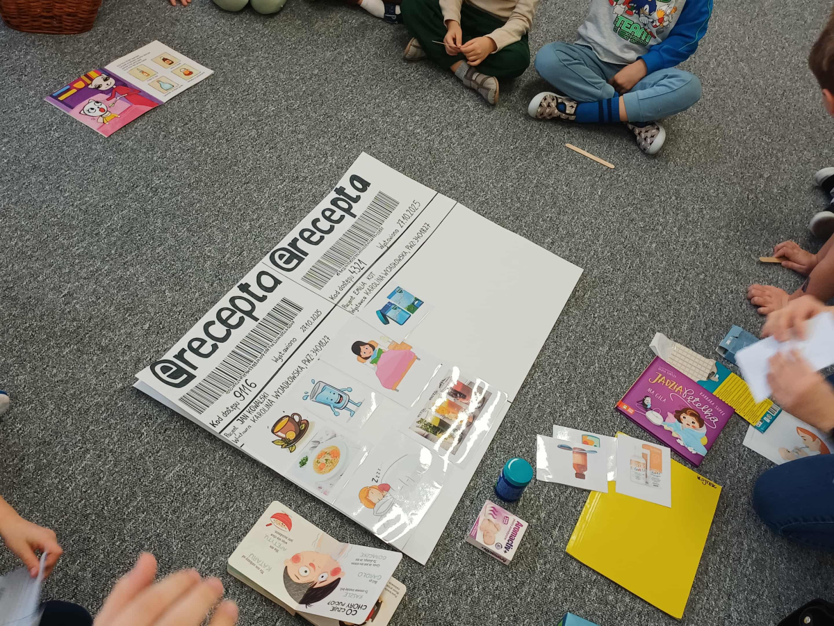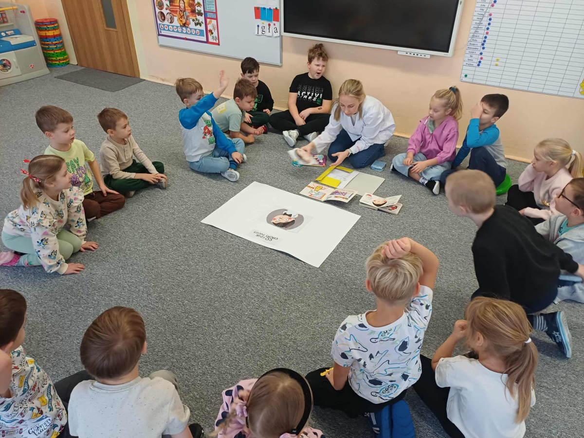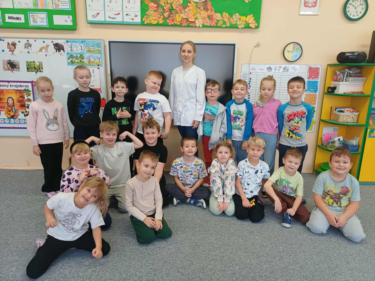 Wizyta pani doktor, mamy Wojtusia, w przedszkolu okazała się wspaniałą lekcją o zdrowiu i emocjach, opartą na ulubionych przez dzieci książeczkach. Pani doktor, w profesjonalnym stroju i z uśmiechem, opowiadała o swojej pracy, wykorzystując historie dobrze znane przedszkolakom. Na przykładzie książki "Kicia Kocia jest chora" wytłumaczyła dzieciom, że gabinet lekarski to przyjazne miejsce, a lekarze i pielęgniarki chcą im pomóc, tak jak pomogli Kici Koci, gdy bolał ją brzuszek. Dzieci dowiedziały się, że badanie nie boli i nie ma się czego bać. Następnie, odwołując się do serii o Pucio, pani doktor omówiła, jak ważne jest nazywanie i wyrażanie emocji związanych z chorobą czy wizytą u lekarza. Podkreśliła, że strach jest naturalny i zawsze można o nim porozmawiać z rodzicami lub lekarzem. Dzieci z entuzjazmem uczestniczyły w zabawie, badając siebie na wzajem za pomocą stetoskopu i innych bezpiecznych akcesoriów medycznych. Każde dziecko, naśladując Kicię Kocię, mogło osłuchać "pacjenta" i sprawdzić, jak bije jego serduszko. Na koniec dzieci wykonały z ciastoliny bakterie i wirusy. Wizyta była nie tylko pouczająca, ale także terapeutyczna. Dzięki połączeniu wiedzy medycznej z lubianymi książkowymi bohaterami, dzieci oswoiły lęk przed lekarzami i zrozumiały, że dbanie o zdrowie i emocje jest bardzo ważne.