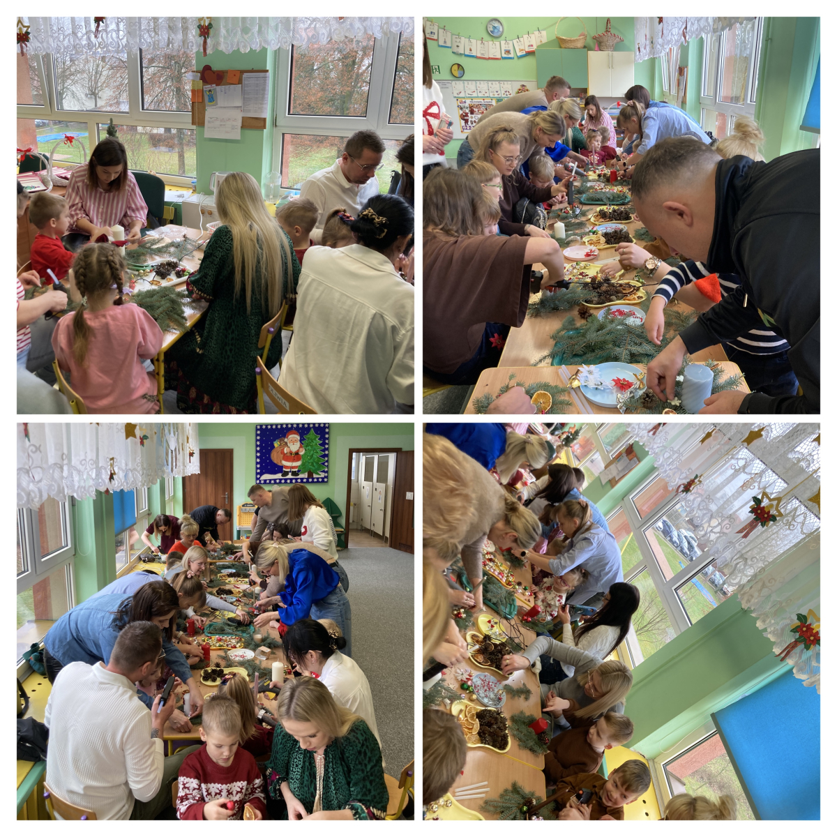 W dalszej części spotkania uczestnicy wzięli udział w warsztatach plastycznych, podczas których dzieci wraz z rodzicami wykonywali stroiki świąteczne. Wspólna praca rozwijała kreatywność, współdziałanie oraz była okazją do miłego spędzenia czasu w świątecznym nastroju.